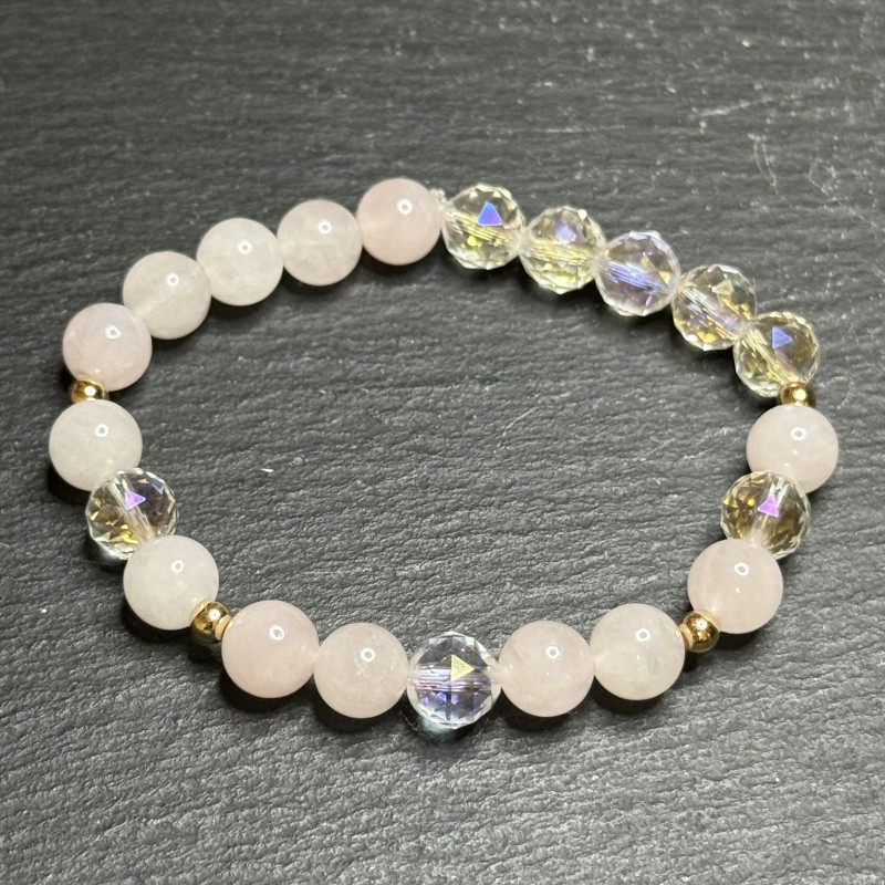 Krásný originální náramek vytvořený z Chalcedonu, Andělské aury a Kříšťálu, dozdobený komponenty a Swarovski srdíčky.